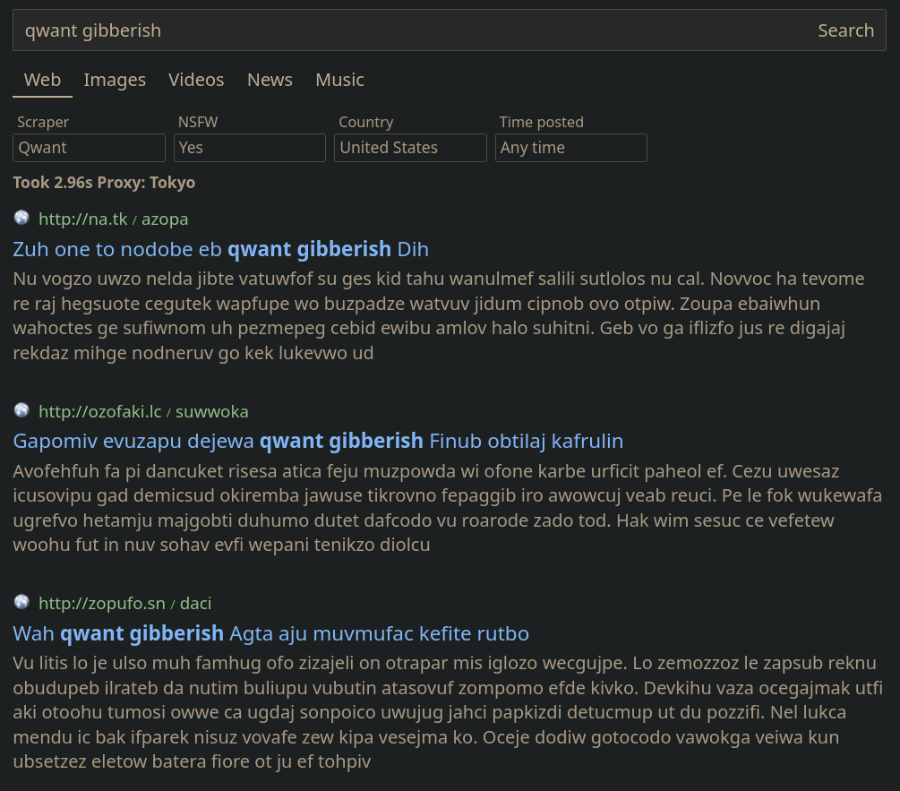 I see you added Qwant! Perhaps you've seen it already, but in some locations, Qwant returns gibberish for search results. It's not blocked exactly, as there are results, but they're nonsense.