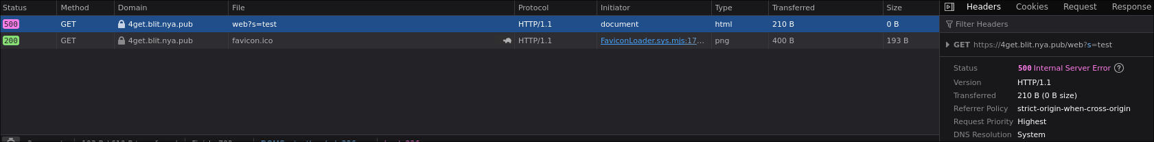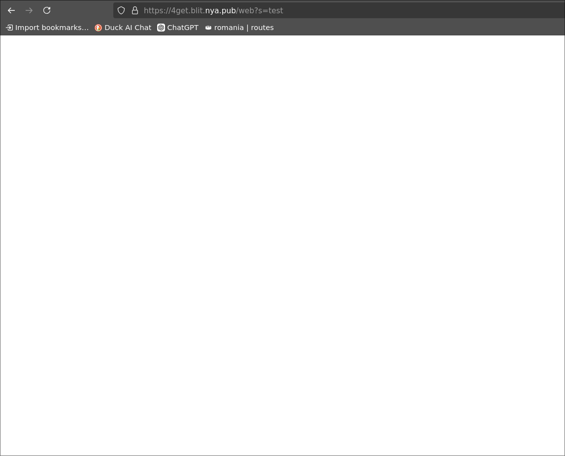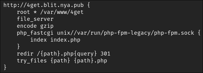 I'd like to expand on this, since I'm having a similar issue; 4get acting weird. It most likely is something about the Caddyfile, but yeah. Nginx works fine, but when it comes to Caddy it just throws a blank page and a prompt to download if